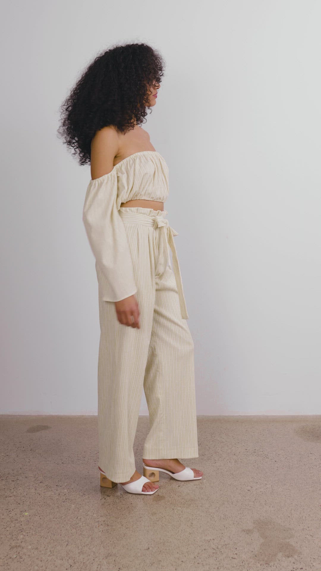 These paper bag pants are a flattering silhouette with a tie waist detail and subtle darts. Made from Seersucker fabric these pants are a relaxed cut with a wide leg.