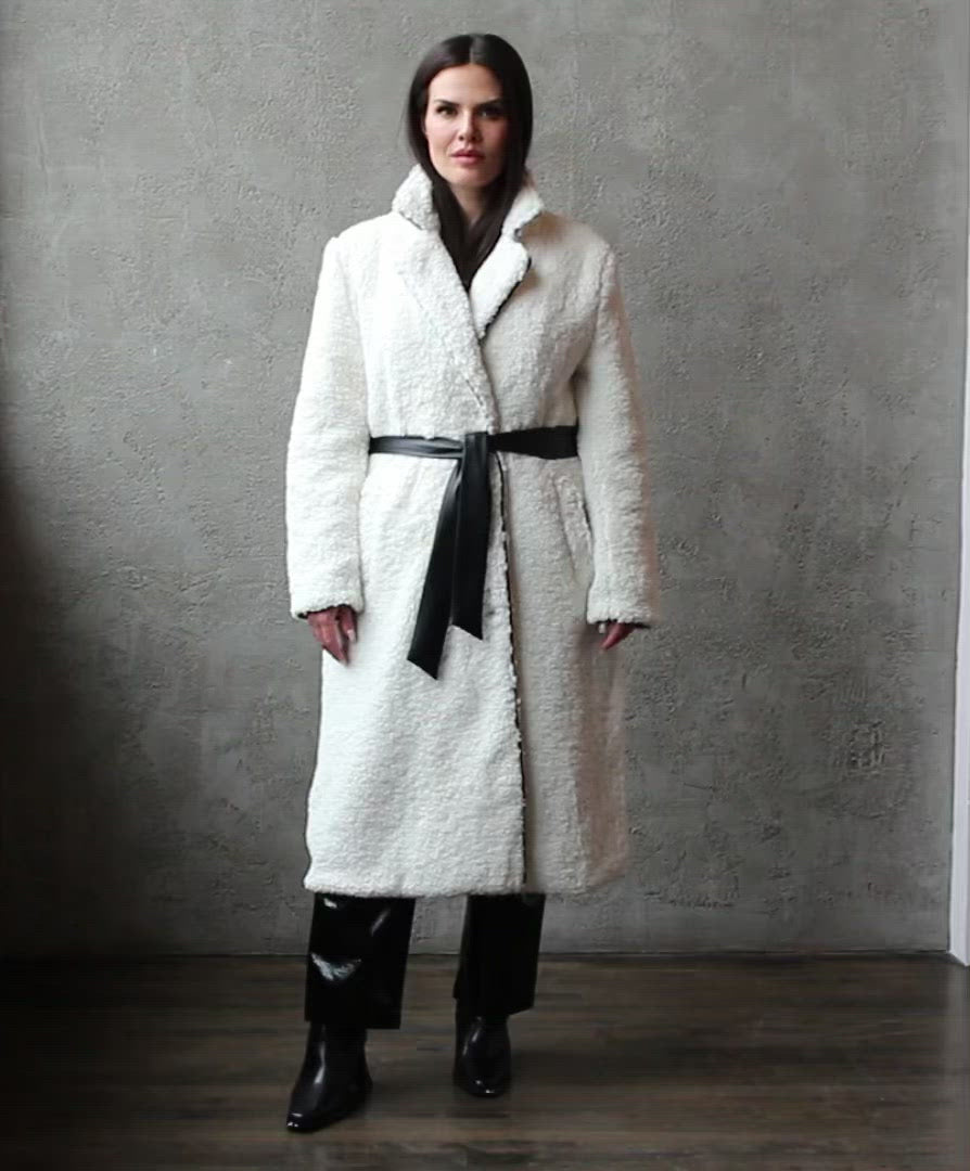 This all over cozy, vegan shearling trench coat is fashion re-imagined. The off-white shearling is crisp in colour and features contrast piping around the hem and on the wrap belt. The single breasted closure nods to trench coat styling while lending itself to easy on and off.  This coat fits true to size and is thick and warm. We love this coat styled with trendy denim and a heeled boot, thrown over the shoulders with a dress or bundled up with a hat and gloves for an evening walk. Fully lined this coat features pockets for all your essentials.
