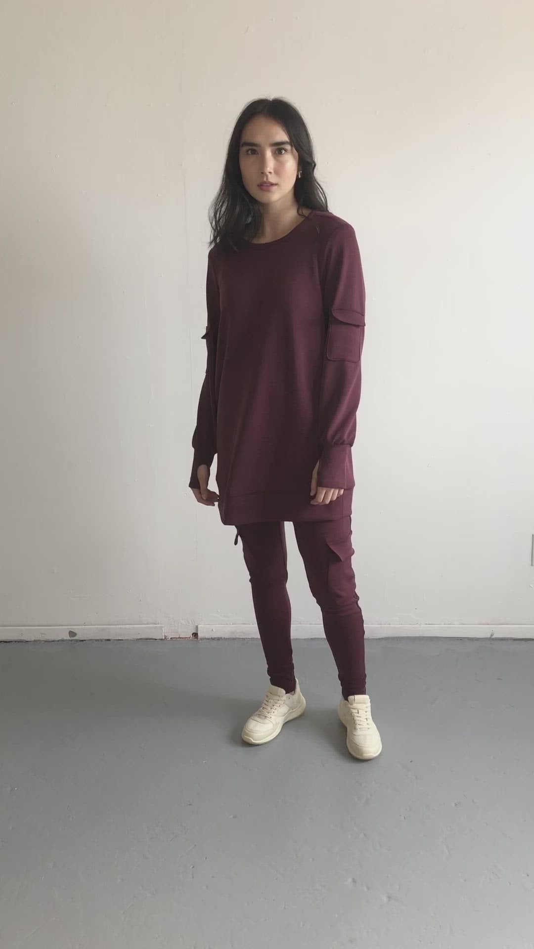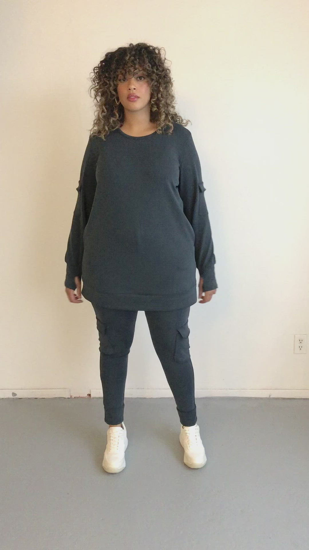 The Long Crew Neck Sweater is great back to leggings or shorts, as it's longer length is built for comfort. Features a cargo pocket styling, and side seam pockets.